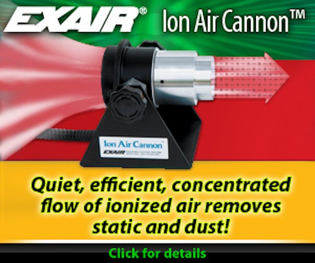 | | | | Sponsored | | EXAIR's Ion Air Cannon neutralizes static electricity, cleans at distances up to 15 ft. It maximizes ionized airflow while minimizing compressed air consumption. A small amt of compressed air is used to entrain a high volume flow of surrounding air. |