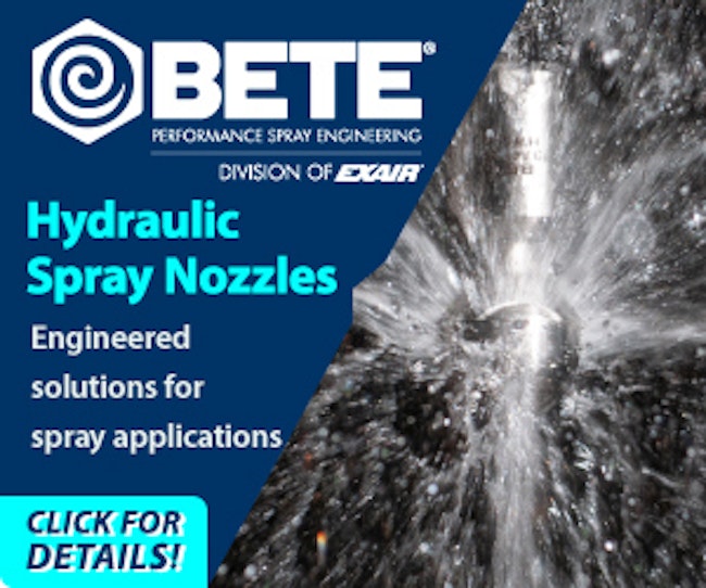 | | | | Sponsored | | BETE improves spray processes worldwide for numerous markets and you can now find those same hydraulic nozzles on EXAIR.com. BETE has an efficient and effective solution to help optimize your process. |
