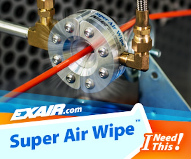 | | | | Sponsored | | Super Air Wipe provides a uniform 360° airstream that is ideal for blowoff, drying, cleaning & cooling of pipe, cable, extruded shapes, hose, wire and more. The split design offers easy clamping around the surface of the material moving through it. |