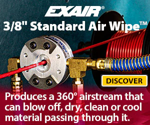 | | | | Sponsored | | Super Air Wipe provides a uniform 360° airstream that is ideal for blowoff, drying, cleaning & cooling of pipe, cable, extruded shapes, hose, wire and more. The split design offers easy clamping around the surface of the material moving through it. |
