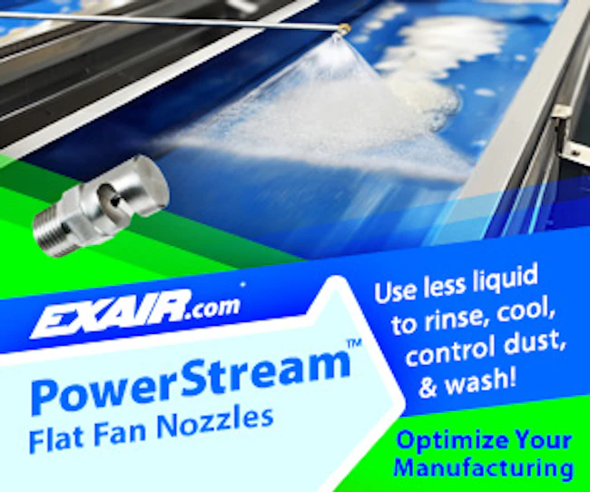 PowerStream Liquid Atomizing Spray Nozzles are the latest addition to EXAIR's large selection of air atomizing and liquid atomizing spray nozzles. They have a deflected flat fan pattern.